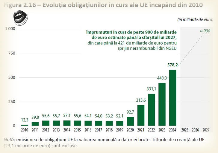 Dacă în anul 2019, totalul împrumuturilor făcute de Uniunea Europeană abia ajungea la 52 de miliarde de euro, la sfârșitul anului 2024 cifra urcase la 578 de miliarde. Iar potrivit estimărilor oficiale, în 2027 se va atinge pragul amețitor de 900 de miliarde de euro – adică de aproape 18 ori mai mult decât în urmă cu doar opt ani.